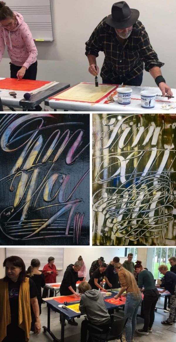 Dílna praktického umění písma s uměleckou knihařkou Eliškou Čabalovou. Písmo v pohybu, pohyb v písmu, práce s barvou na škrobovém podkladu, seznámení s plochým písmařským nástrojem.